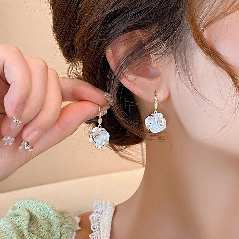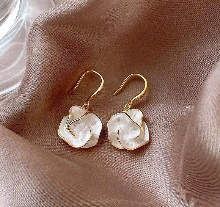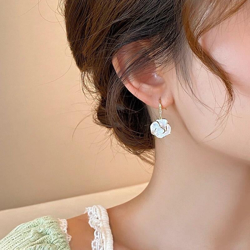 The Lustre Camellia Earrings feature softly layered pearly petals outlined with delicate gold, giving the camellia a fresh, glowing look. Light, feminine, and easy to match, they bring a gentle elegance to both casual outfits and dressier moments. It’s the kind of accessory that feels simple yet instantly elevates your style without trying too hard.