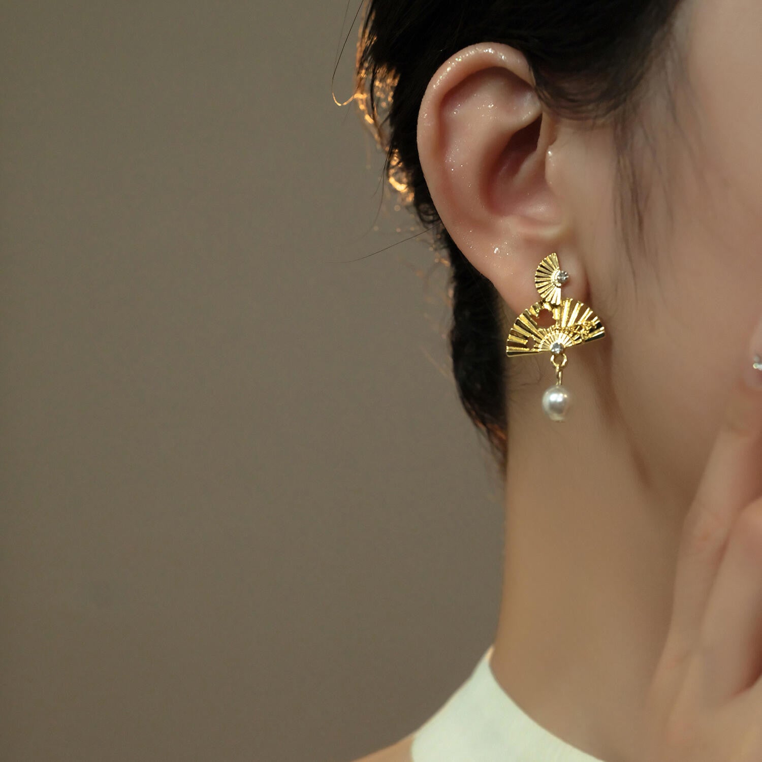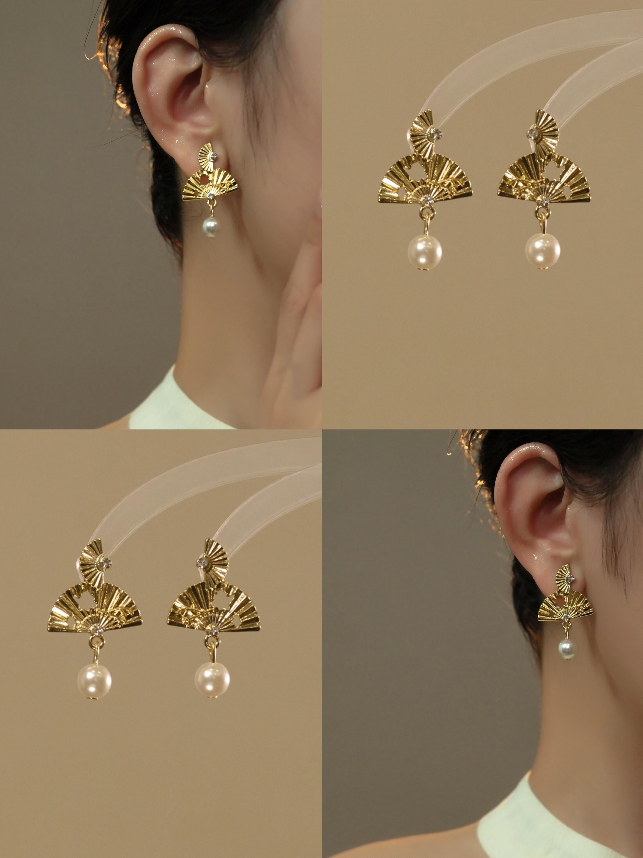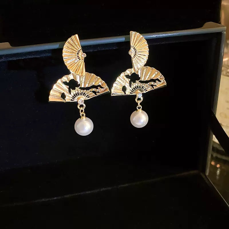 The earrings blend cultural tradition with winter elegance. Each piece features a pair of tiered golden fans inspired by historical ceremonial fans once used in ancient winter festivals. The textured ridges mimic frost-kissed patterns, while the delicate cutouts evoke migrating birds gliding across cold skies. A single luminous pearl hangs beneath, capturing the quiet glow of a full winter moon.