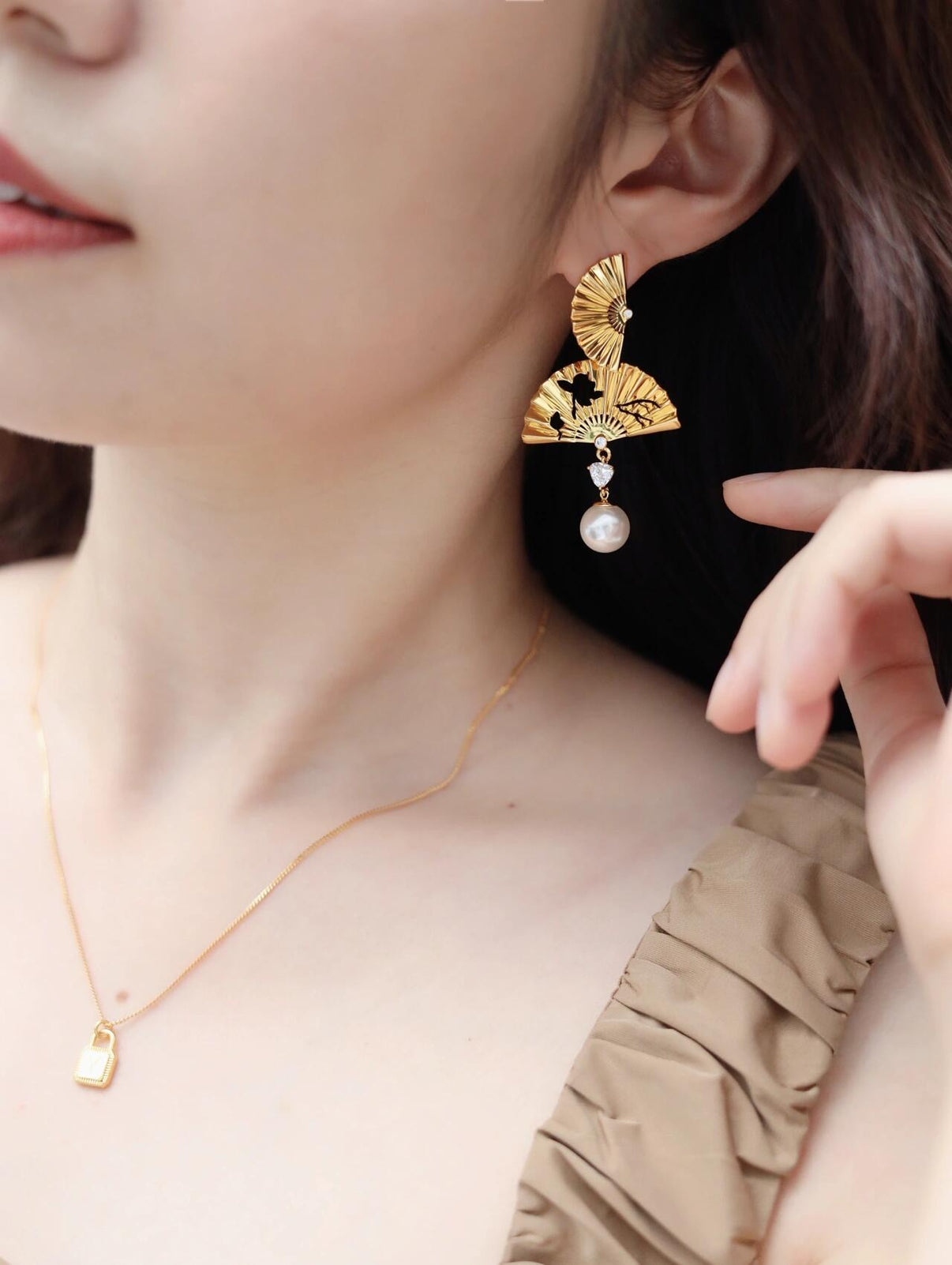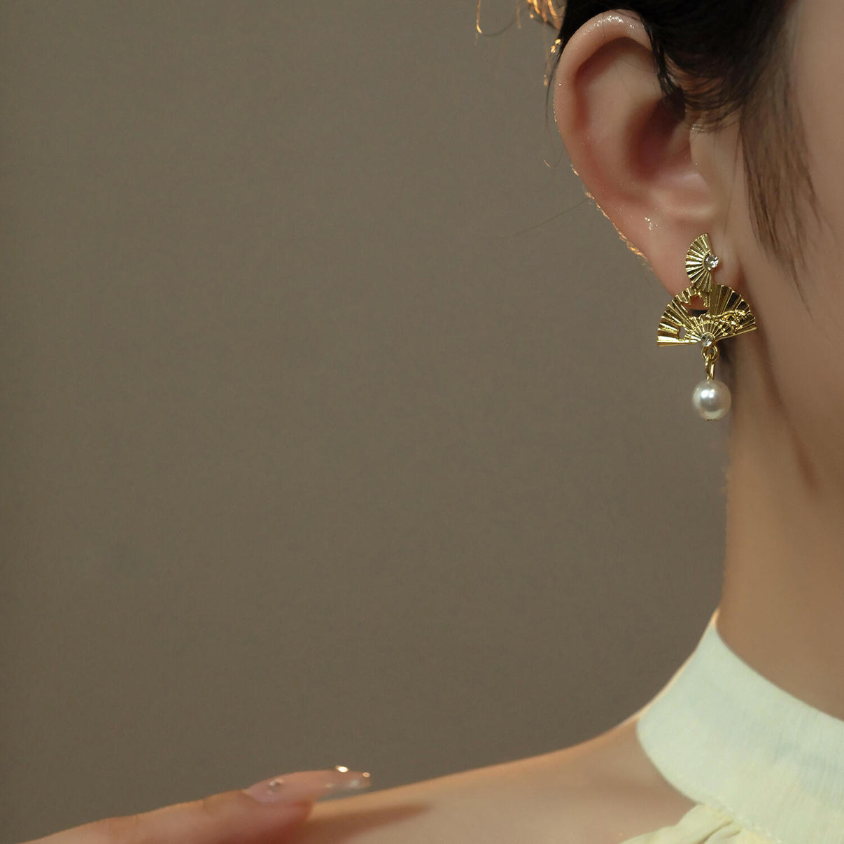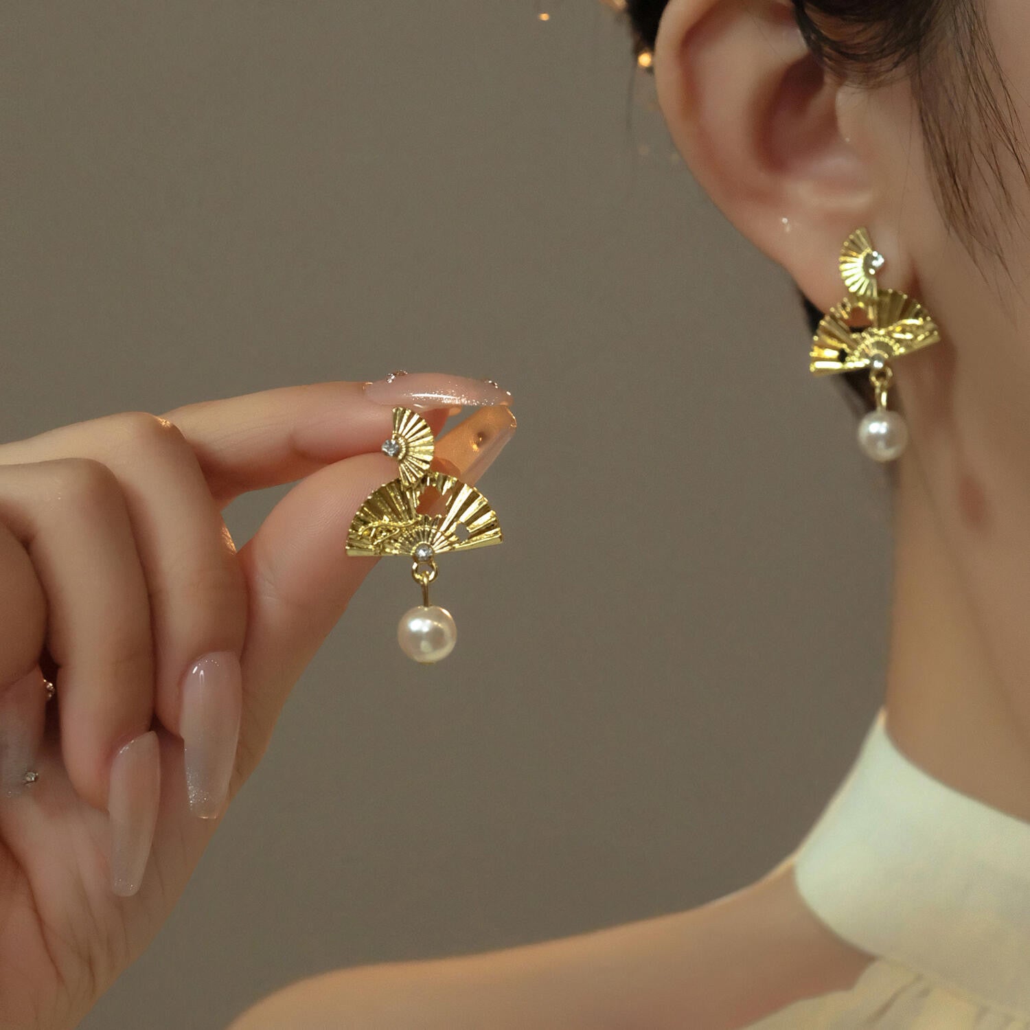The earrings blend cultural tradition with winter elegance. Each piece features a pair of tiered golden fans inspired by historical ceremonial fans once used in ancient winter festivals. The textured ridges mimic frost-kissed patterns, while the delicate cutouts evoke migrating birds gliding across cold skies. A single luminous pearl hangs beneath, capturing the quiet glow of a full winter moon.